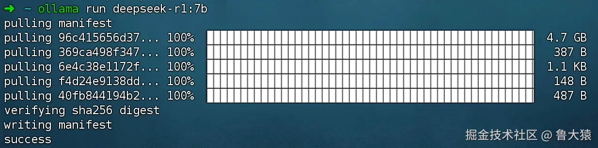 运行命令 ollama run deepseek-r1:7b 安装 DeepSeek R1 模型。