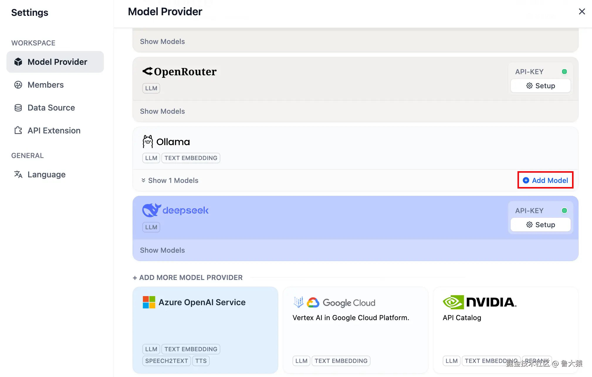模型供应商内的 DeepSeek 对应在线 API 服务;本地部署的 DeepSeek 模型对应 Ollama 客户端。请确保 DeepSeek 模型已成功部署由 Ollama 客户端部署,详细部署说明请参考上文。