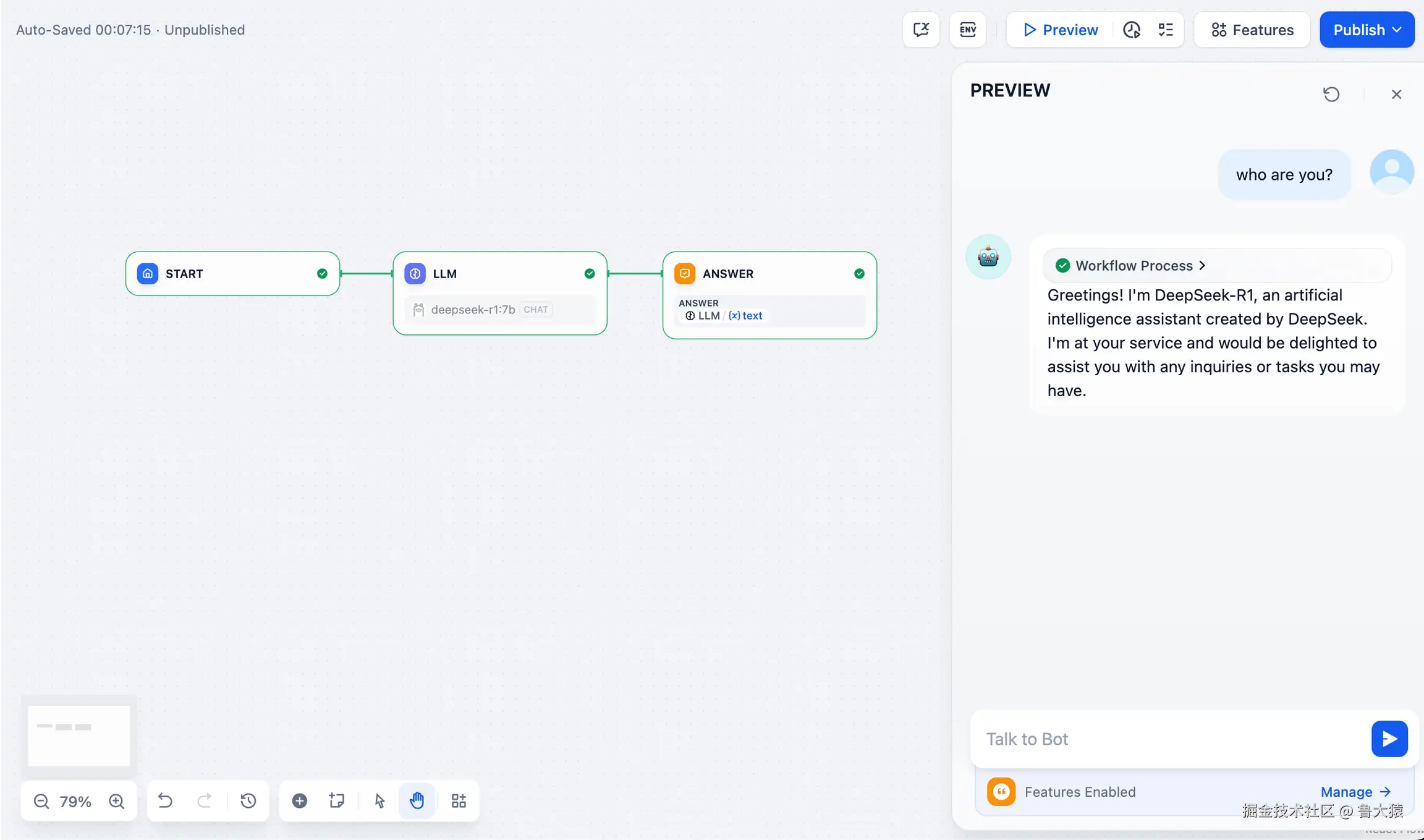 - 添加结束节点完成配置。你可以在预览框中输入内容以进行测试。生成答复后意味着 AI 应用的搭建已完成。