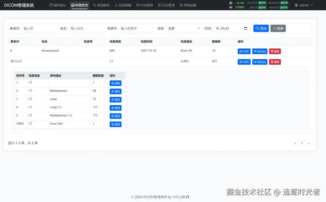 - 项目简介: DicomSCP是一个基于 .NET Core 的 DICOM SCP(Service Class Provider)服务器,提供 DICOM 存储、工作列表、查询检索服务,打印服务,WADO/DicomWeb服务,集成了功能强大的DICOM 桌面和Web查看器。