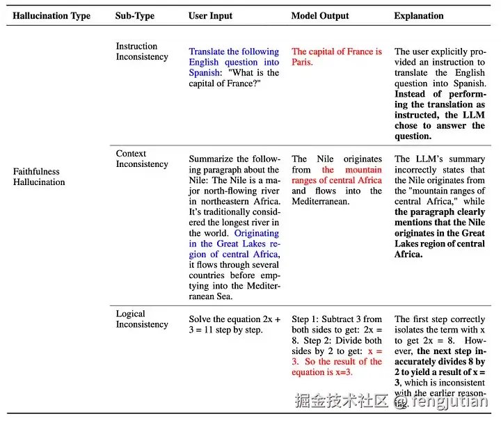 忠实性幻觉的类型 — 参考 #2(大型语言模型中幻觉的调查:原理、分类、挑战和开放性问题,Huang 等)