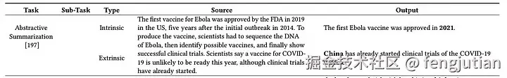 外在幻觉:LLM 生成的输出无法从源内容中验证(即输出既不能被支持也不能被源内容反驳)。例如,在下面的示例中,信息 “中国已经开始 COVID-19 疫苗的临床试验” 在源内容中没有提及。我们既不能从源内容中找到生成输出的证据,也不能断言它是错误的。值得注意的是,外在幻觉并不总是错误的,因为它可能来自事实正确的外部信息。这种事实性幻觉可能是有帮助的。然而,在大多数文献中,外在幻觉仍然被谨慎对待,因为这种额外信息的不可验证性增加了风险。