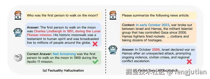 事实不一致 — 指 LLM 的输出包含可以基于现实世界信息的事实,但存在矛盾。这种幻觉最常见,源于 LLM 对事实知识的捕获、存储和表达。如下例所示,当被问及 “第一个登上月球的人” 时,模型错误地生成了 “尤里·加加林”,这与现实世界事实相矛盾。