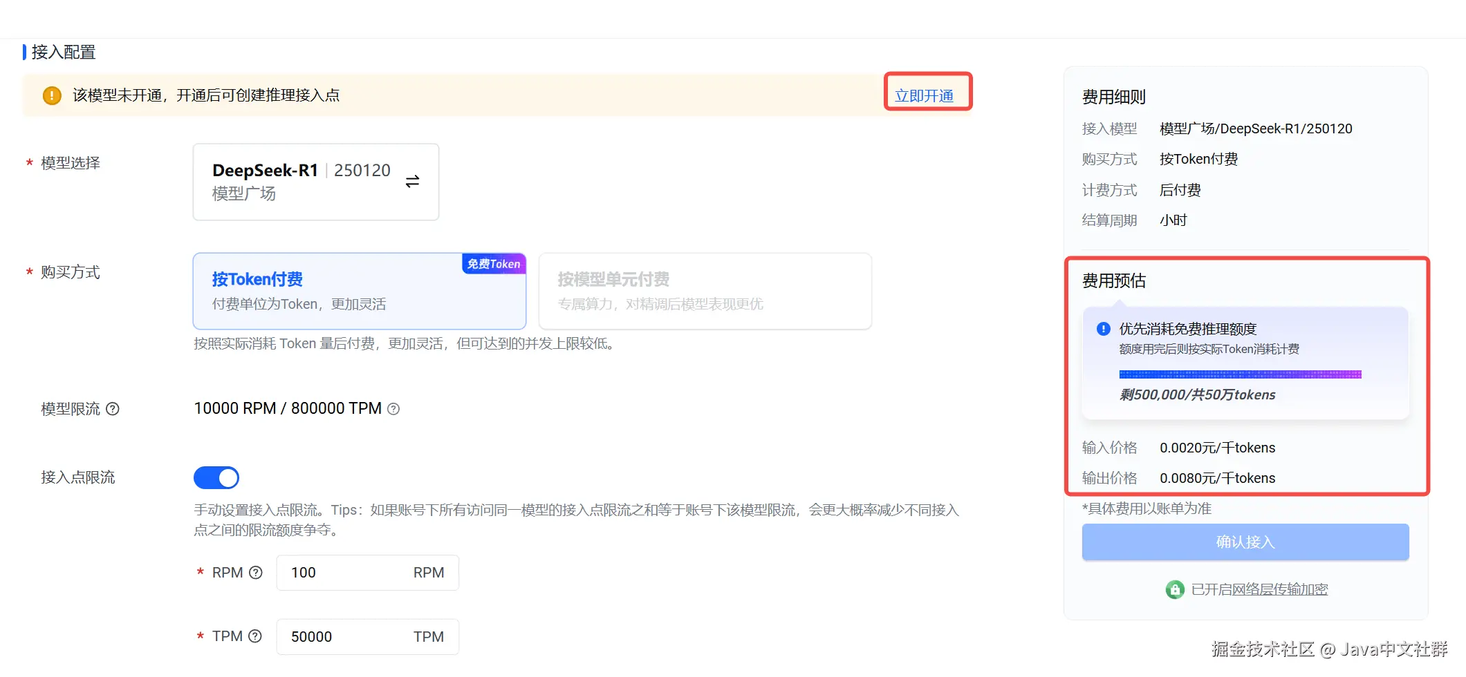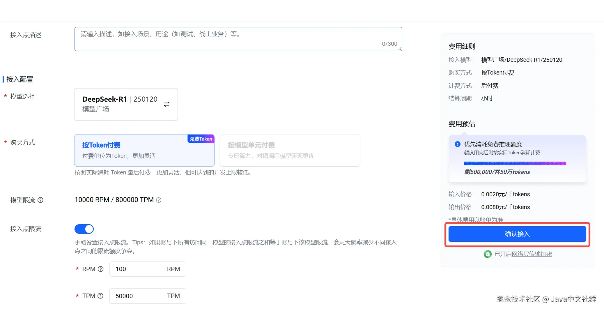 - 限流设置:为了避免 Token 用完后自动扣费,建议在创建推理接入点时设置限流。