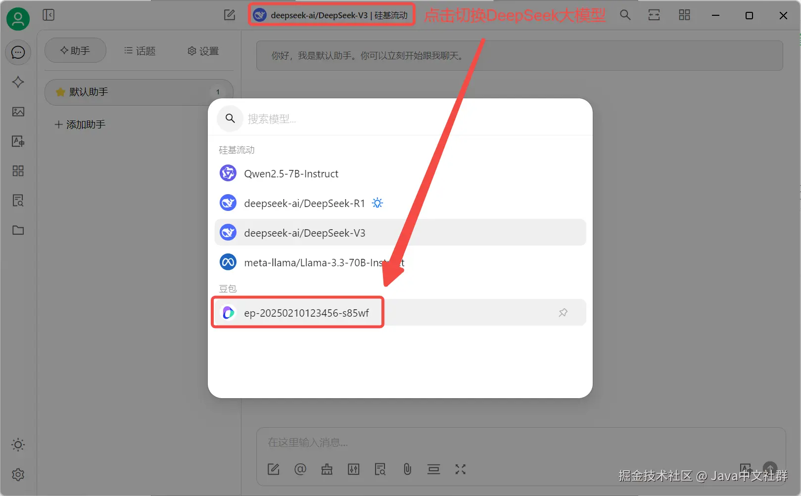 - 选择模型:在 Cherry-Studio 的主界面中,选择你刚刚添加的 DeepSeek 模型。