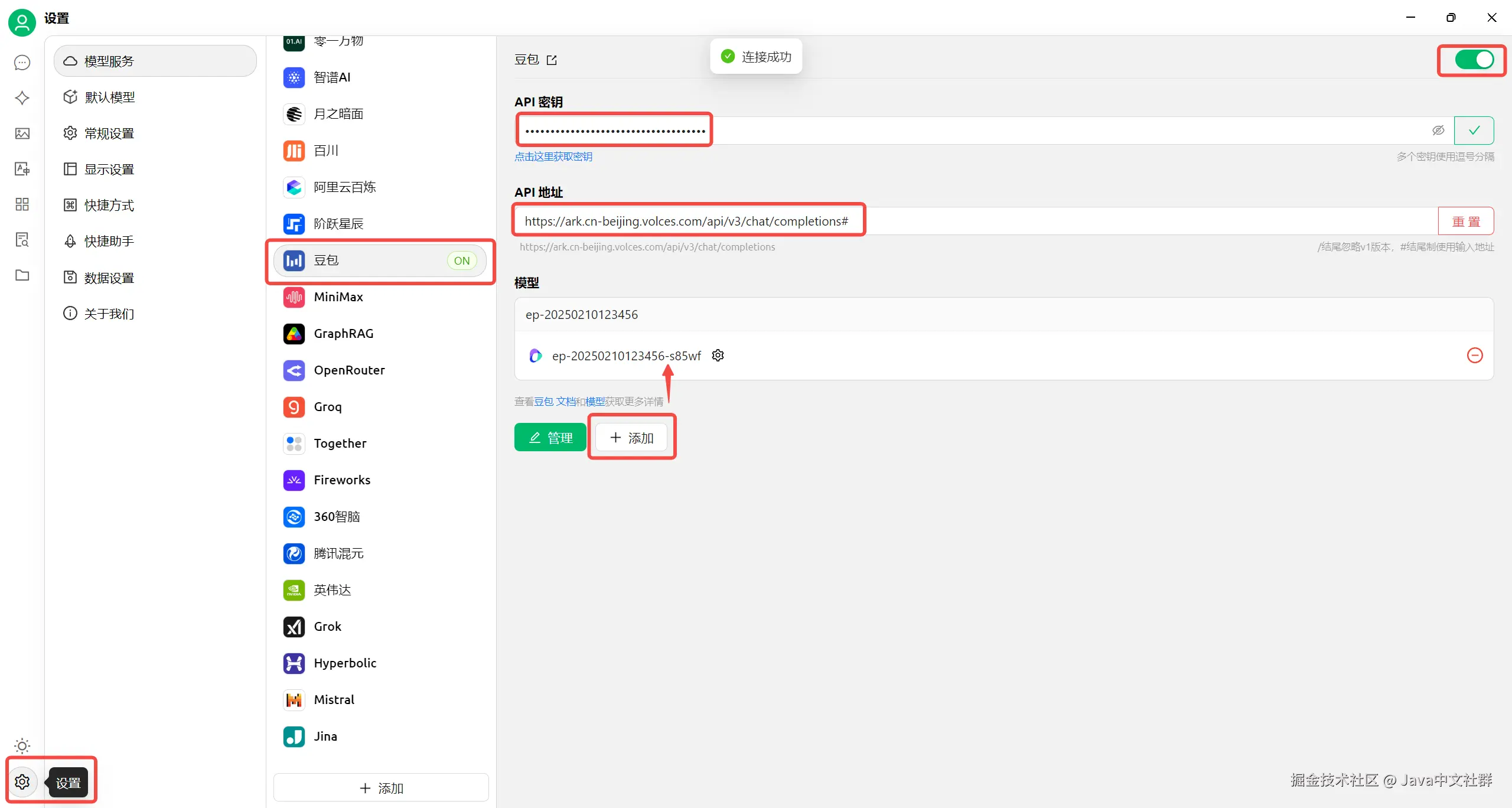- 在设置页面中选择“模型服务”:选择“豆包”作为模型提供商。