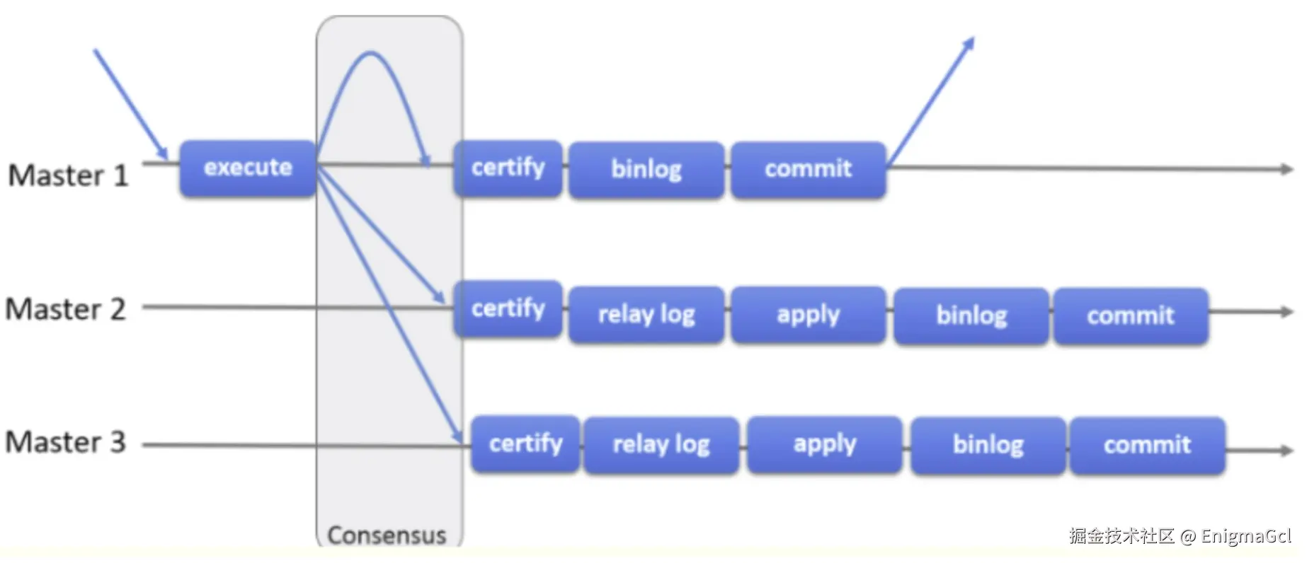 该方案跟 MGR 区别为 MGR 每个库都是全数据,只是在库之间利用一致性协议确保数据一致性,MGR 本质是主备,而分布式数据库是指数据只有一份,分散存储在不同节点,MGR 原理如下: