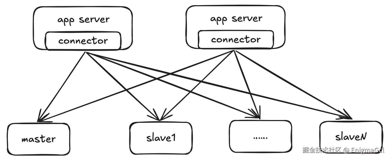 早期方案,每个客户端持有一个 connector,该 connector 保存主从库信息(ip 或者域名或者 VIP),并且持有读写逻辑,读语句走从库,更新语句走主库