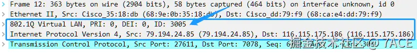 但是为什么会出现这样的情况,乱序的数据段出现在了 ACK 确认之后。之后仍是在数据包文件中发现的端倪,发送端和接收端两个方向的 Vlan ID 不一致,该 Vlan ID 是通过镜像在 TAP 上标记,由此推断出可能造成乱序的原因是由于取自两个镜像会话,再经过 TAP 采集,最终到真正数据包被捕获时,数据包到达的顺序可能就会发生一定乱序,当然时间差距会看起来很小,本案例也就在1微秒左右。