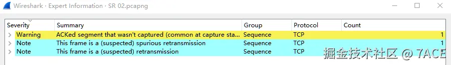 专家信息如下,因为数据包特定截取且数量较少,所以仅有虚假重传、重传、ACK确认未捕获的分段等几个常见问题。