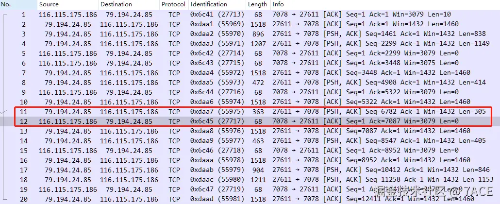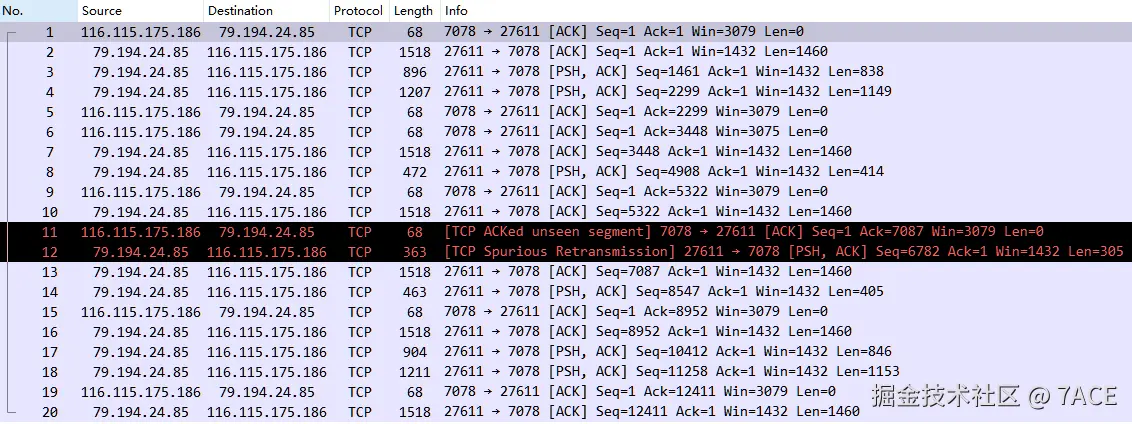 首先 79.194.24.85 为发送端,116.115.175.186 为接收端,接收端 No.11 ACK Num 为 7087 ,确认了 Seq Num 7087 之前的所有数据分段,但实际上因为发送端 No.10 的 Seq Num 5322 + Len 1460 < 7087,所以 No.11 标识为 [TCP ACKed unseen segment] 表明确认了未看到的数据段。