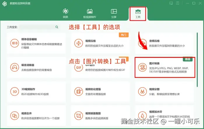 步骤1:运行数据 蛙视频转换器,选择【工具】的选项,点击该工具界面下的【图片转换】工具。