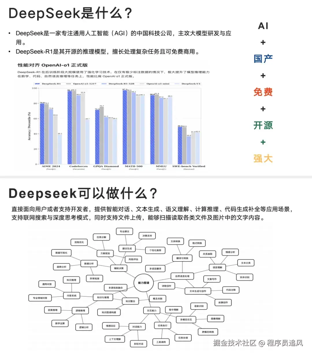 DeepSeek是一款国产、免费且开源的通用人工智能(AGI)。它擅长处理复杂任务,核心功能包括文本生成、语义分析、编程辅助(如代码生成与调试)、数据可视化、逻辑推理等,支持多语言翻译和文件解析,适合个人用户和开发者。