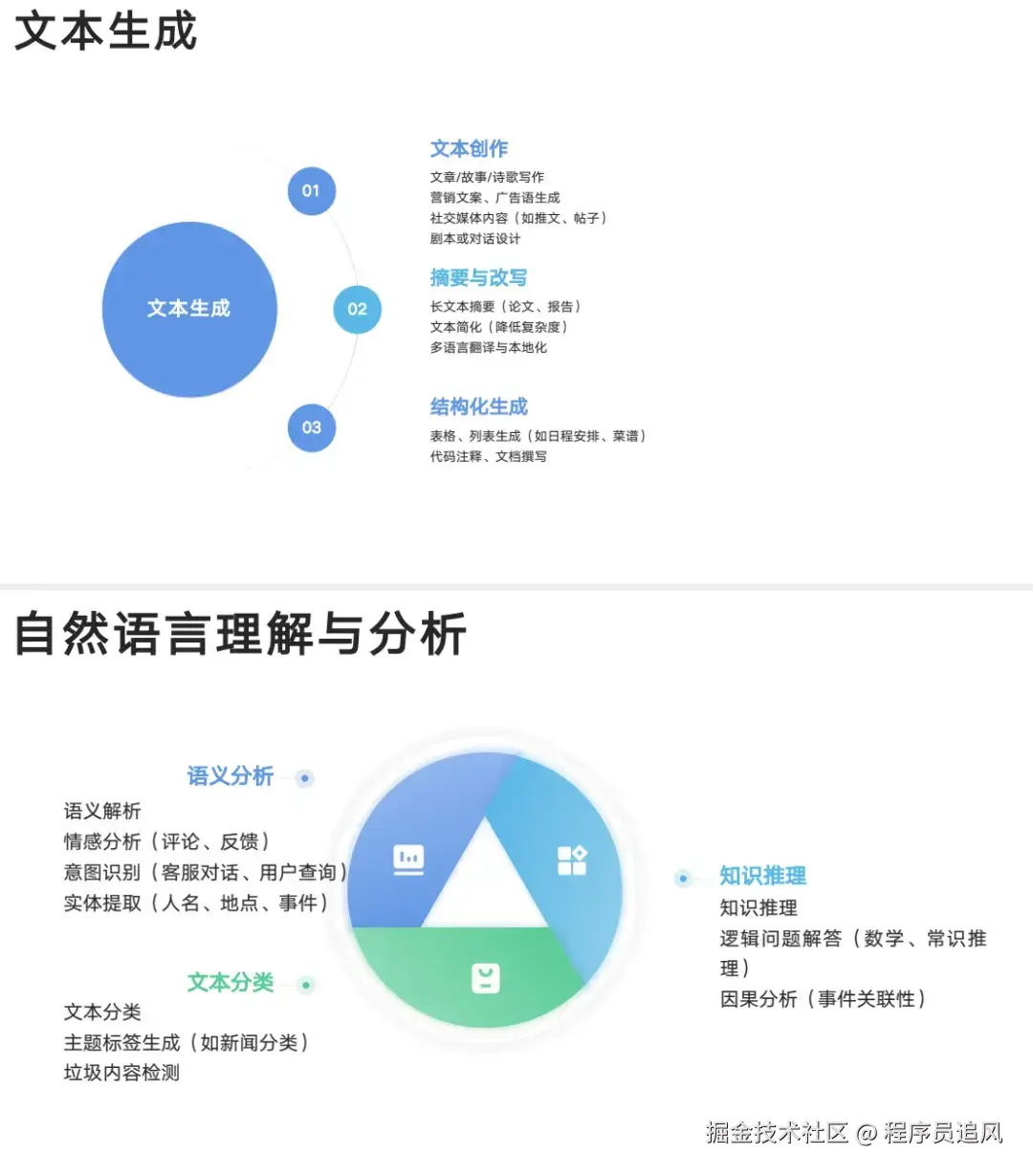 文本生成:写文章、故事、诗歌,生成营销文案、摘要,甚至创作结构化内容(如表格、代码注释)。