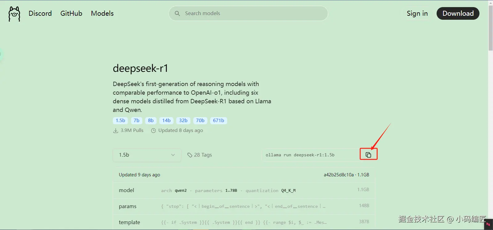 这里是选择DeepSeek蒸馏后的密集模型,注意这里的模型要根据自己的电脑性能来下载,如果资源不足,下载了也会跑不起来,我这里我选择的是第一个最小的模型。