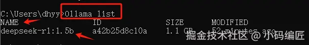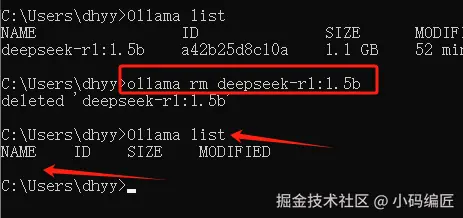 删除完后,再输入Ollama list查看下大模型资源包确认下是否删除,如果没有了大模型资源包的名称了,就确认是完全删除了,到这里大模型资源包就完全删除了,然后Ollama可以在Windows系统程序那里找到正常卸载。