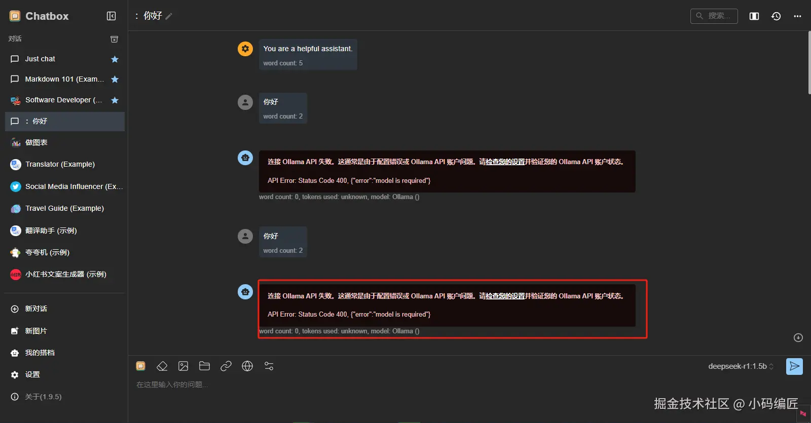 回到ChatBox,到这里就可以开始提问啦,但是我下载的这个是最小的模型,貌似知识库有点旧,我问了今天是几月几日,他回答是2023年1月27日,实际今天是2025年1月30日,实际推理能力我没测试,大家可以试试。
