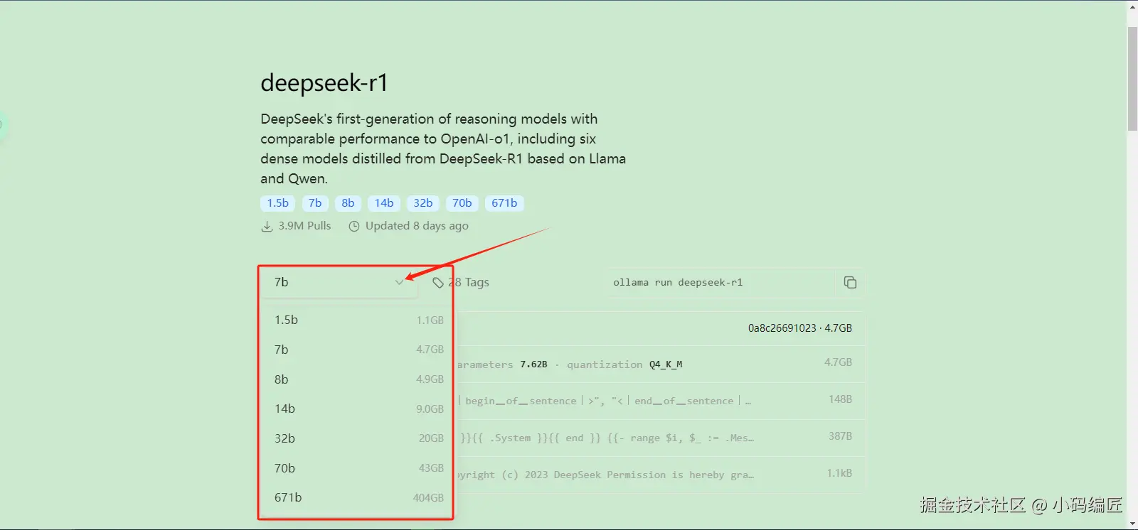 数字越大,代表参数越多,所需资源也越多,1.5b=15亿参数,其他自己换算下,对应的资源和模型我放个图,大家自己对应下。