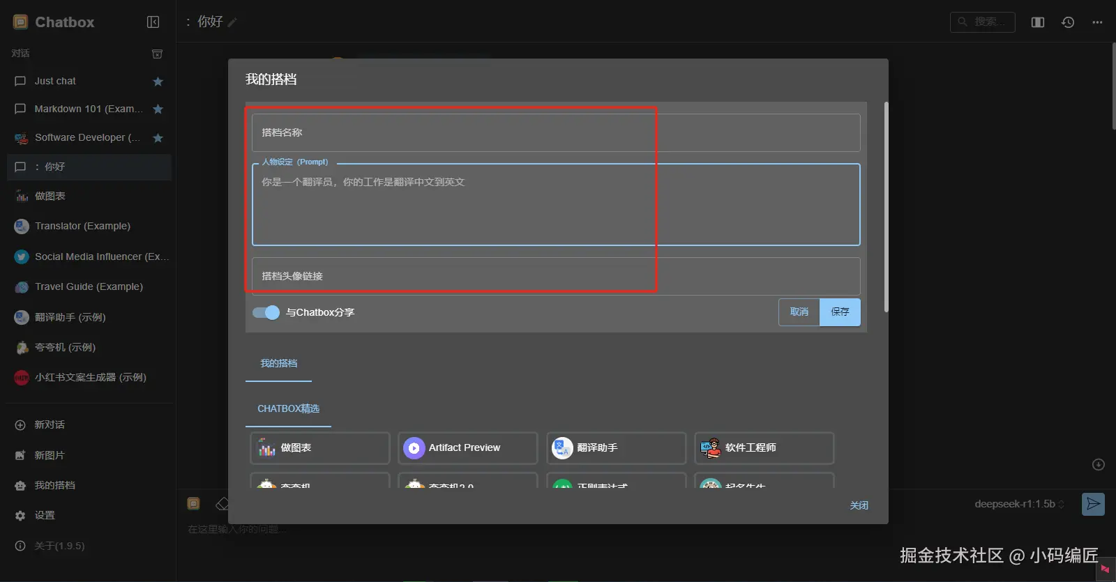 ChatBox还可以创建自己的智能体,输入智能体名称和人物设定就保存可以啦。