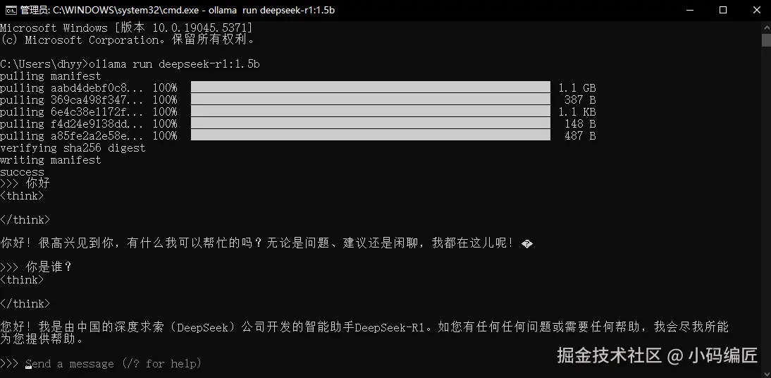 然后回车开始下载,这里略过下载过程,这里是下载完成后的截图,下载完成后就可以提问了,没想到这么简单吧,哈哈哈。