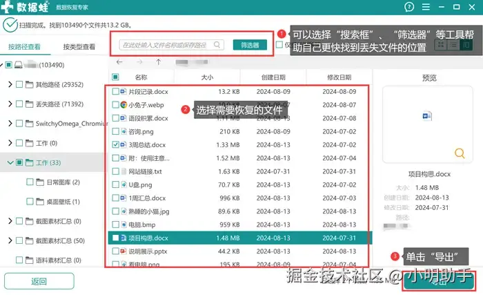步骤3: 选择需要恢复的文件,点击“恢复已选的文件”,然后完成文件恢复。