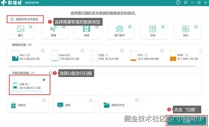 第1步: 连接好U盘后。在电脑里打开软件,进入软件的首页后,选择好需要恢复的文件类型和U盘,最后点击“扫描”;