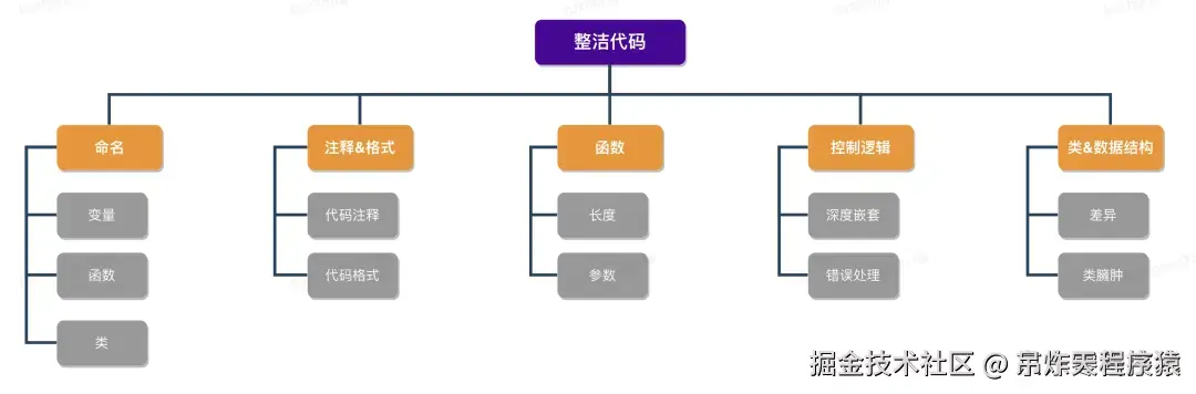 要实现整洁代码,手段有多种,可以是前面提到的设计模式的运用、代码的重构,也可以通过集体 code review 来发现代码中的 bad smell,团队的代码规范、检查工具等。这里将整洁代码中的关键点列举出来,你可以在写代码或重构时加以关注。