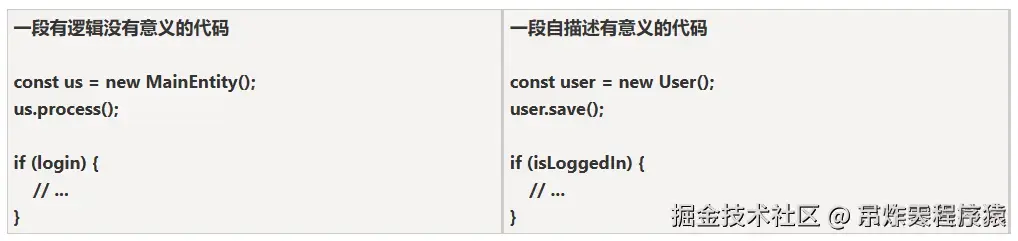 看左侧的这段代码,它可能是任何对象,做了一个不知道什么操作的处理动作。再看右侧的代码段,即使没有任何注释,也能明白用户保存操作。