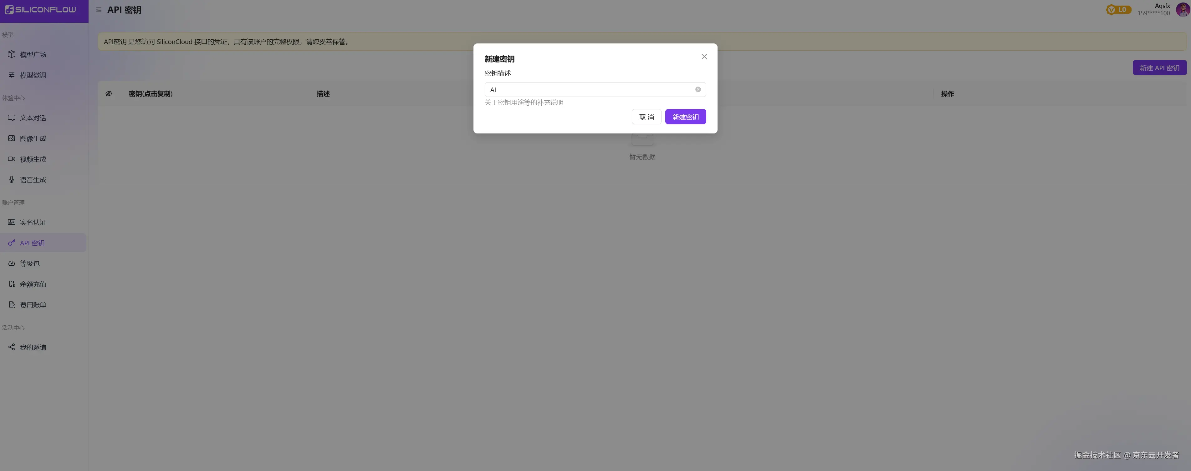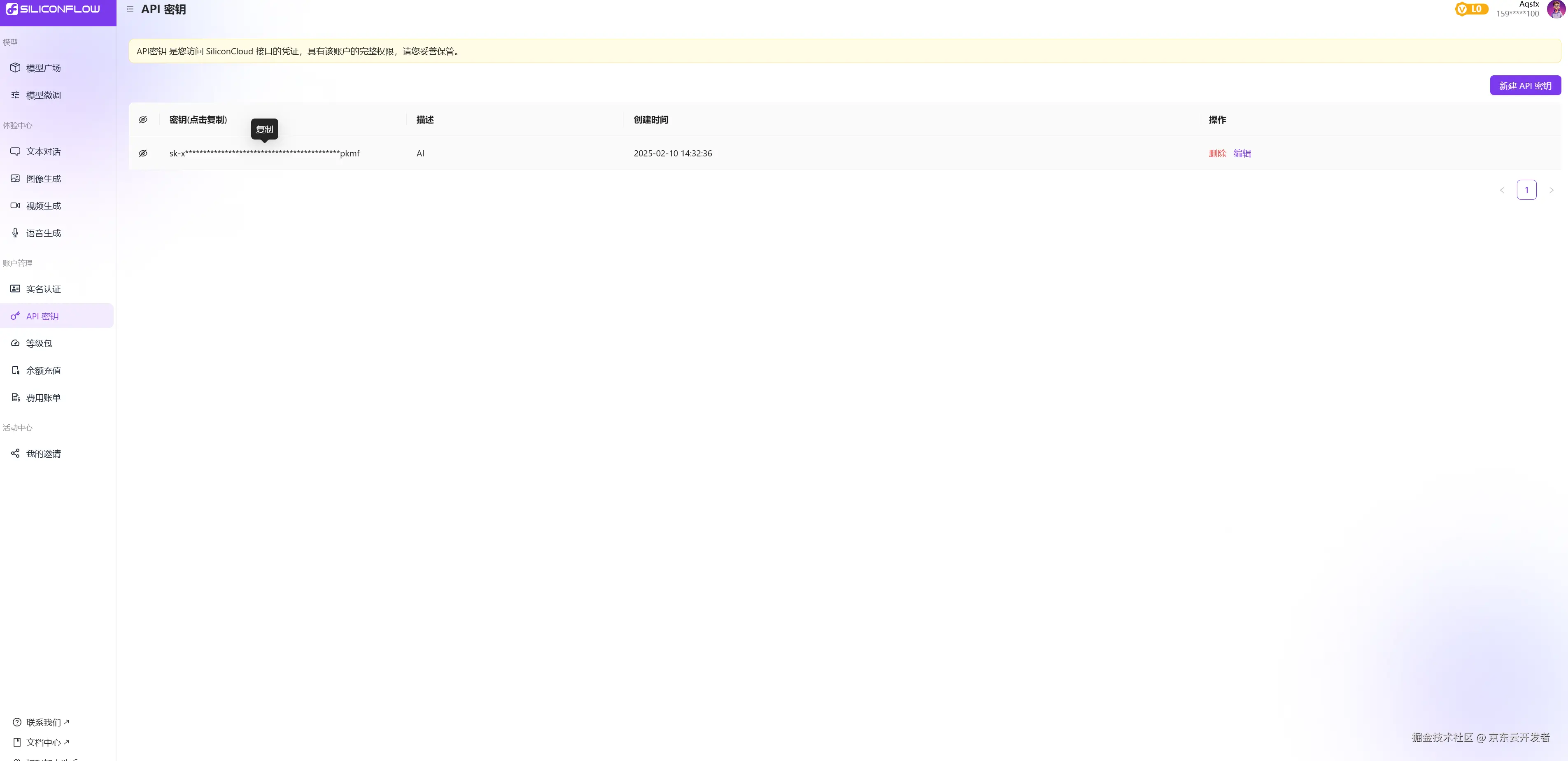 点击账户管理下的API秘钥后,新建API秘钥。完成后点击秘钥即可完成复制。