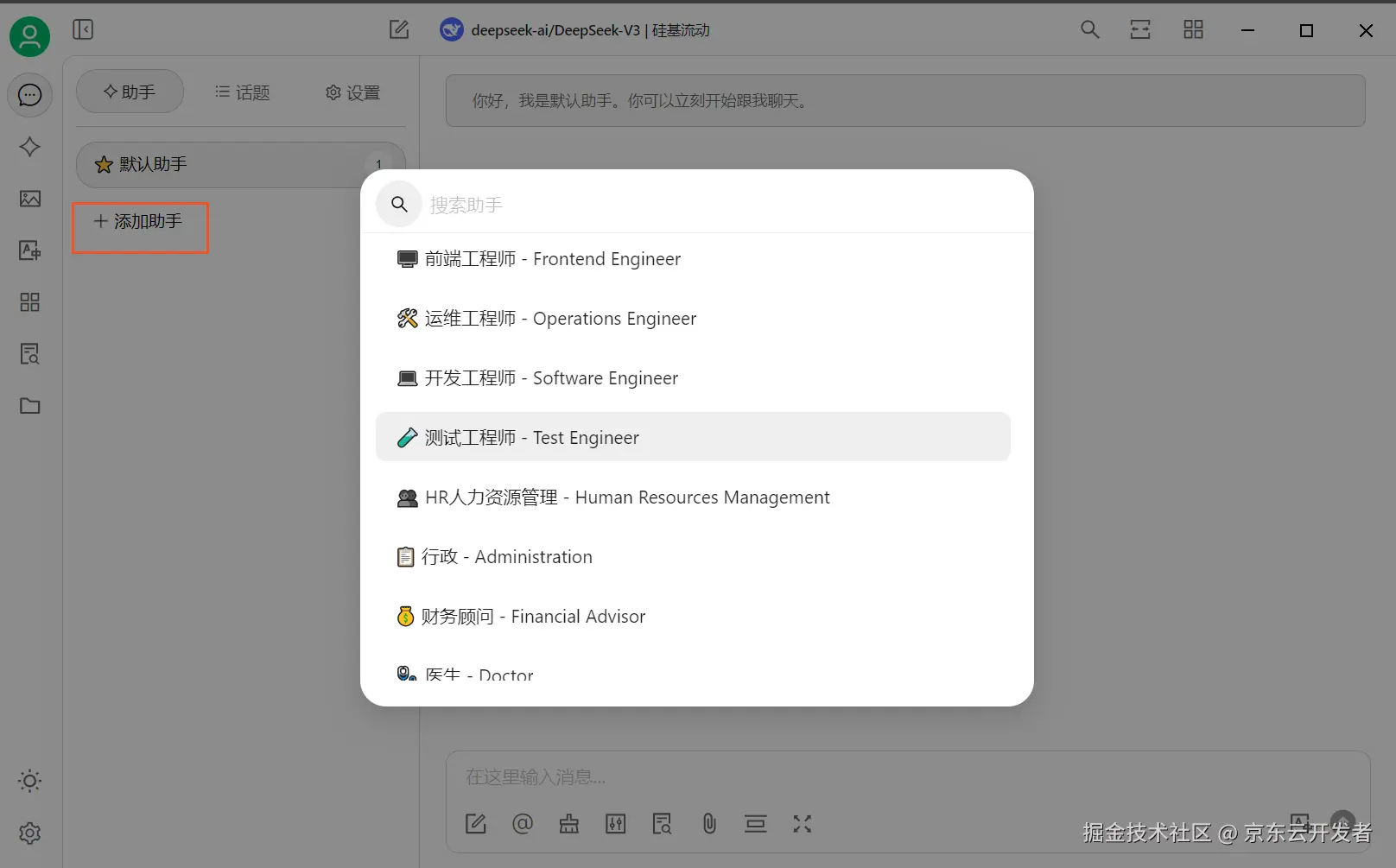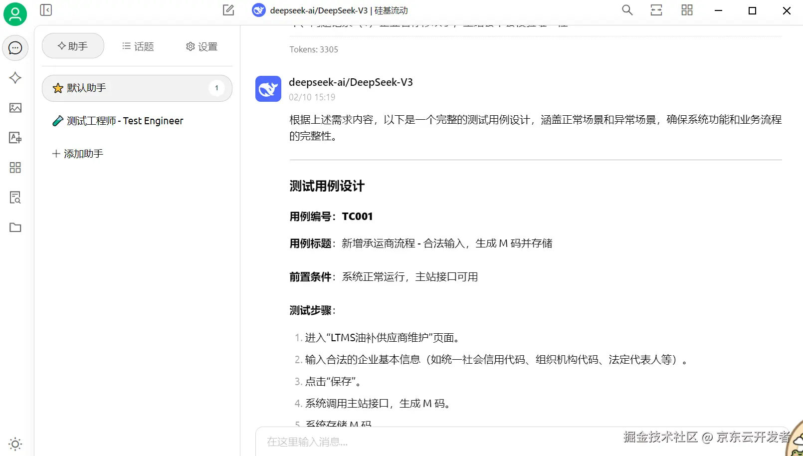另外呢,Cherry Studio预设了一些角色,帮助您省略“您作为一个专业的XXX工程师”的预设话术,比如,我在使用DeepSeek辅助测试用例生成的场景时,当我给助手加个【测试工程师】的人设之后,生成的用例包含了异常场景,当前这部分也可以通过您提问的promot进行自行完善。