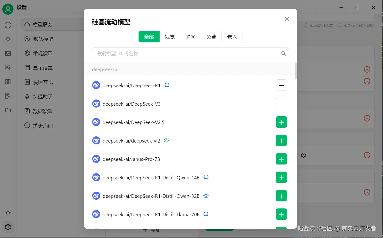 当然,硅基流动支持的全部模型,在这里您也都可以维护勾选,比如模型选择deepseek-ai/DeepSeek-R1。最后点击保存。
