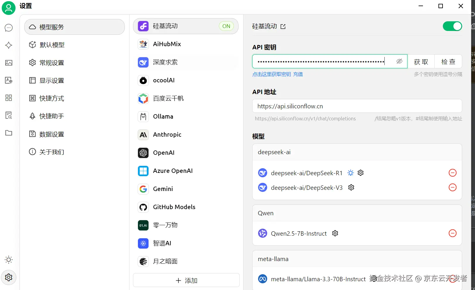 在Cherry Studio客户端-【设置】-选择-【硅基流动】,在这个步骤中进行硅基流动API Key,即上一步骤的新增的秘钥复制过来,点击保存。