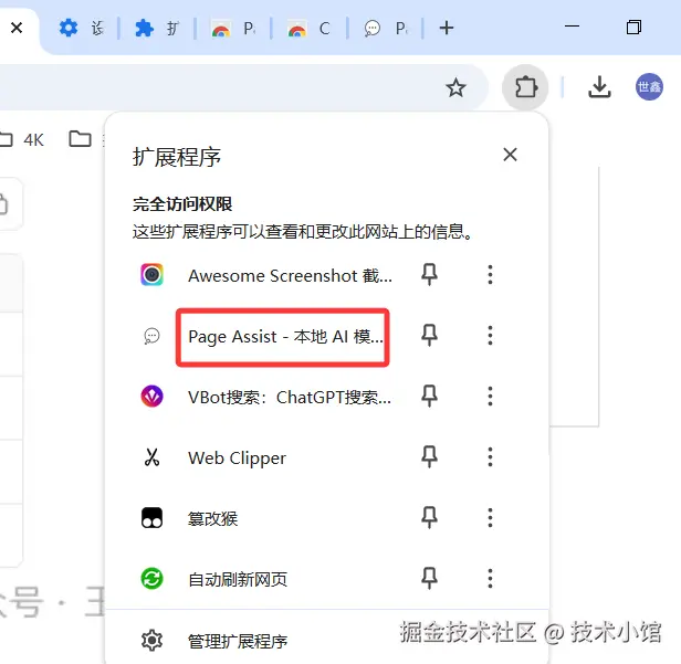 - 点击浏览器右上角的扩展程序图标,找到 Page Assist。