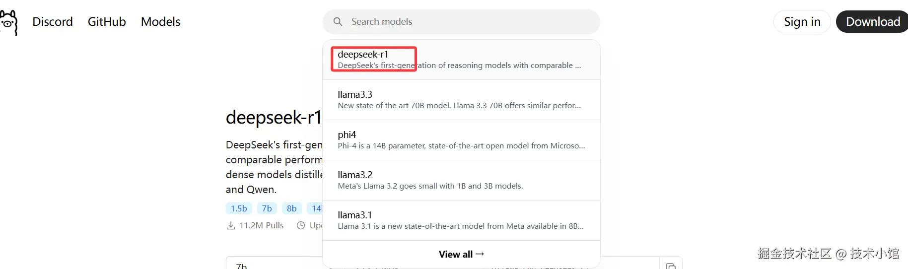- 使用 Ollama 搜索 Deepseek-R1 模型: