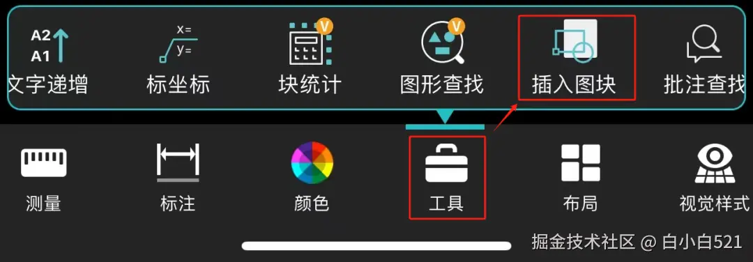 1、打开浩辰CAD看图王移动版,点击工具箱里面的**「插入图块」**功能;