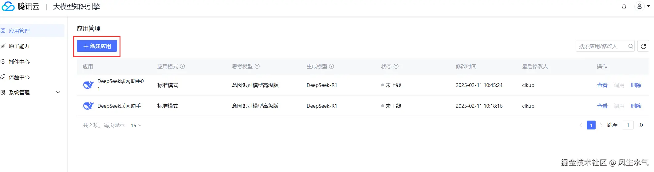 上一步骤中我们看到的最佳实践其实相当于一个模板,如果我们想自己搭建这样一个基于其他大模型的应用(比如接下来出现了一个更厉害的大模型),我们可以在应用管理页面点击【新建应用】(也可以在上图页面右上角点击【创建为我的应用】,基于这个实践模板来创建自己的应用)