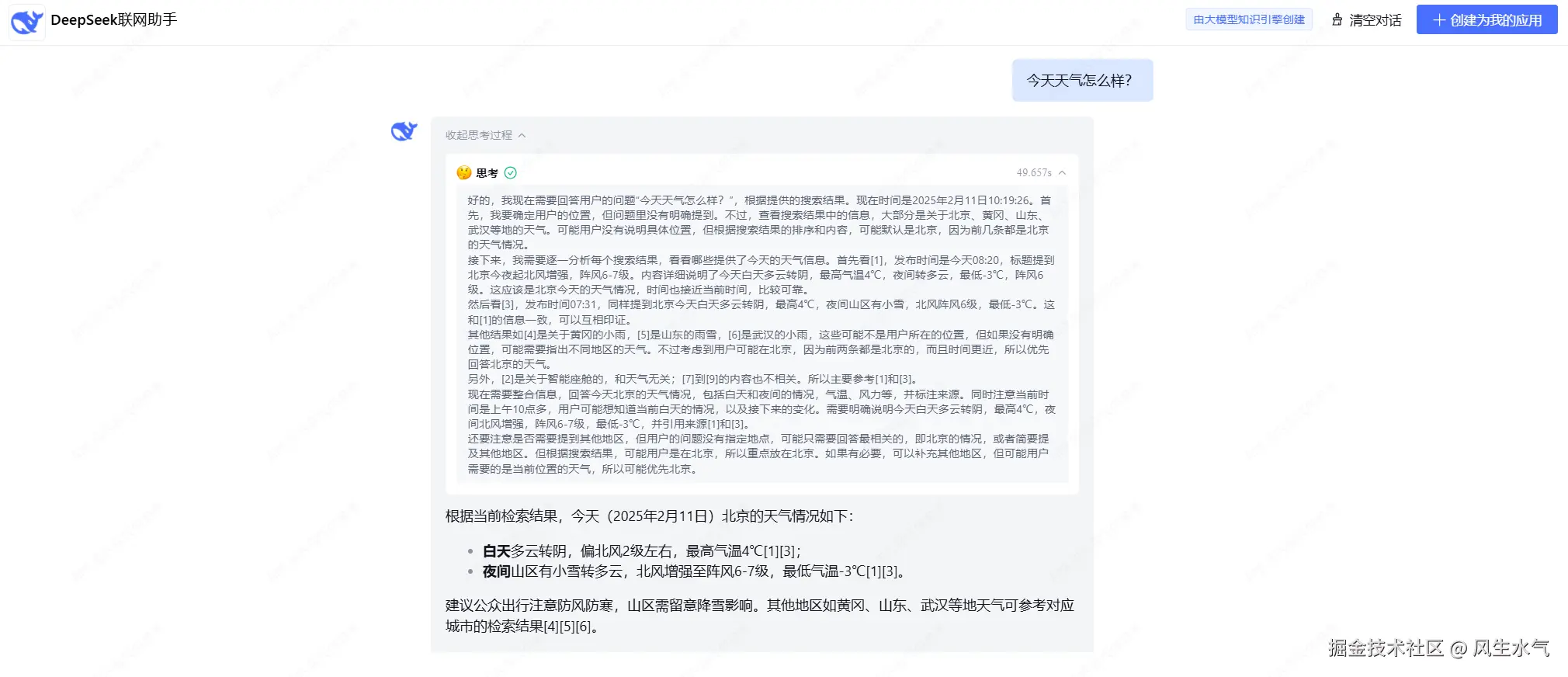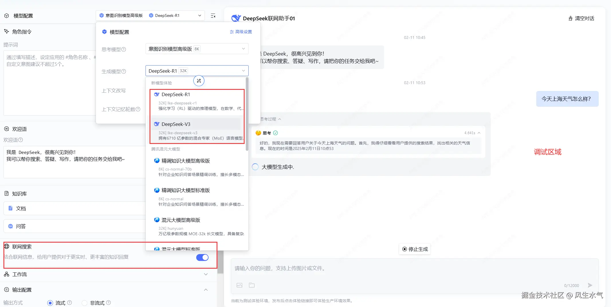 在模型配置这里选择我们需要的模型,比如现在我们期望使用DeepSeek-R1或者DeepSeek-V3。同时如果我们期望使用联网能力,需要在下方打开联网搜索的功能。当设置好之后,我们可以在右侧的调试区域查看效果。