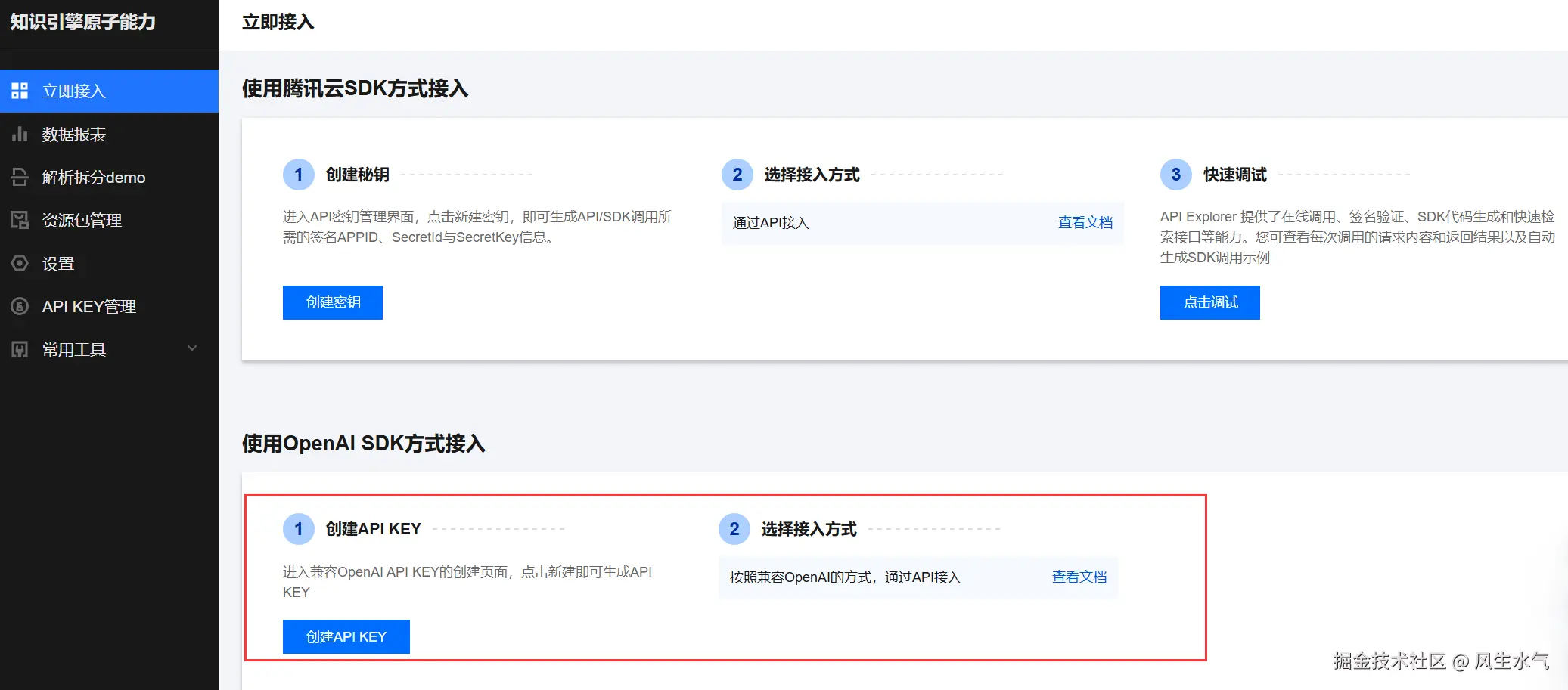 对于一般用户来说,使用我们刚刚发布的应用即可满足我们大部分需求。但对于专业的用户来说,可能希望将应用的能力嵌入到自己的应用中去,这个时候就需要用到API调用了。以openai接口兼容的方式调用为例,首先获取到访问API时的API KEY。