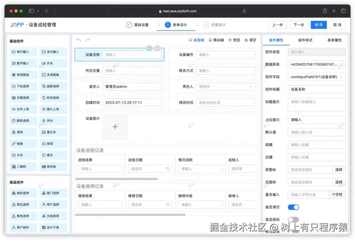 JNPF低代码平台提供了可视化拖拽的面板,支持页面复杂布局。组件栏支持50+种通用组件,并可以组合使用。