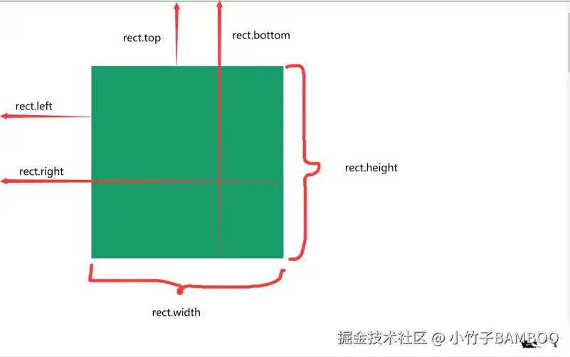 console.log(rect.x); // 元素左边界相对于视口的 x 坐标 console.log(rect.y); // 元素上边界相对于视口的 y 坐标 console.log(rect.width); // 元素的宽度 console.log(rect.height); // 元素的高度 console.log(rect.top); // 元素上边界相对于视口顶部的距离 console.log(rect.right); // 元素右边界相对于视口左侧的距离 console.log(rect.bottom); // 元素下边界相对于视口顶部的距离 console.log(rect.left); // 元素左边界相对于视口左侧的距离