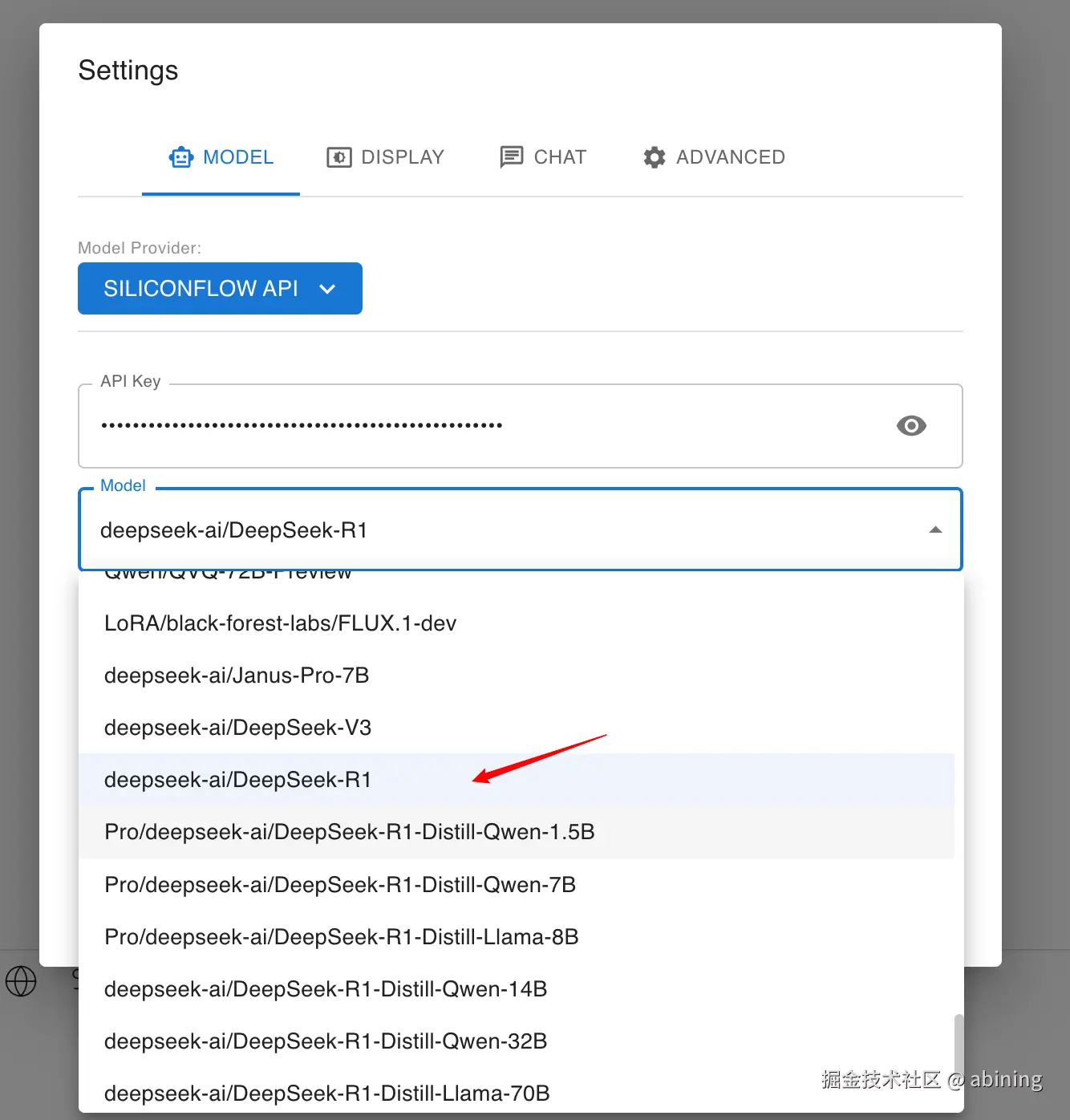 在设置里找到SiliconFlow API选项,粘贴刚复制的密钥,选择DeepSeek R1模型: