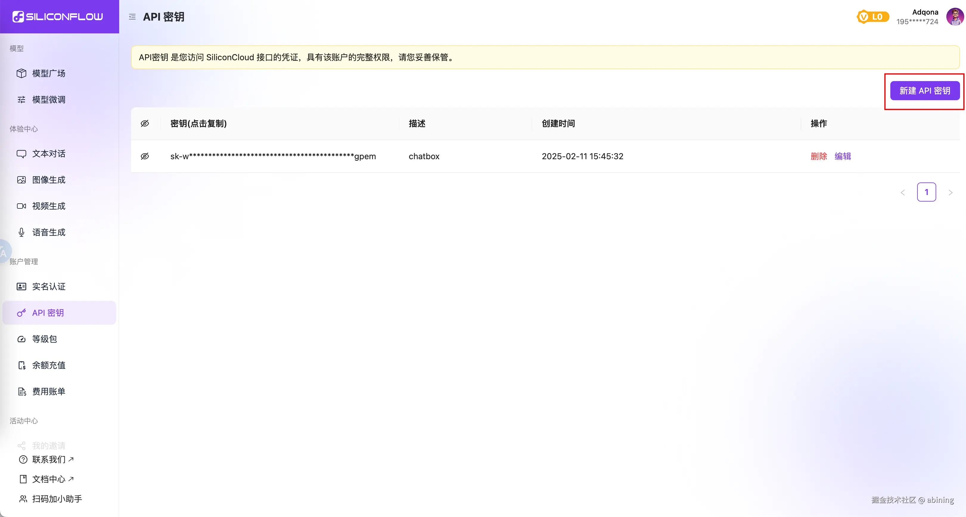 注册后直奔【API密钥】页面,点击新建密钥: