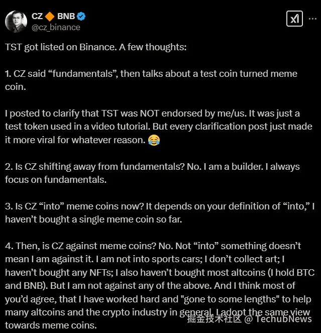 赵长鹏强调该代币最初只是一个视频教程中的测试代币,并未得到他或币安的认可。然而,每次他发文澄清,反而加速了 TST 的病毒式传播,让它迅速成为市场热门 Meme 代币。