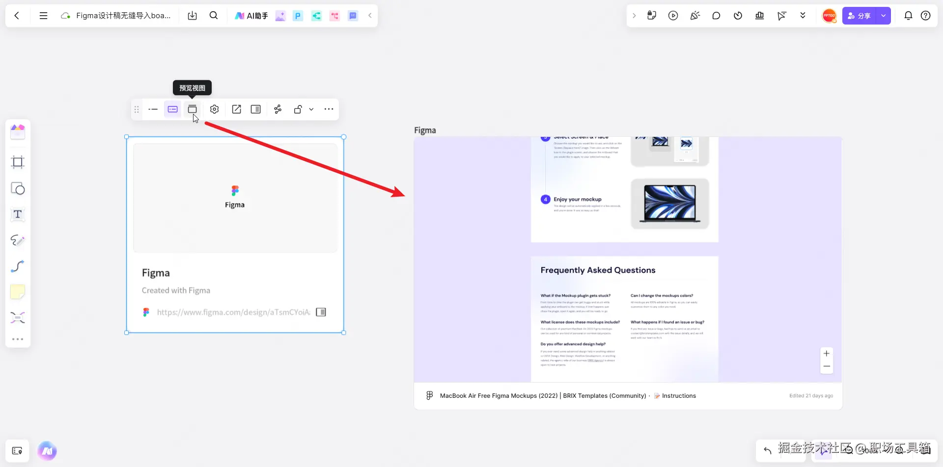 此时,你会看到该链接渲染为Figma卡片,默认为“卡片视图”,无法直接查看设计稿。你需要选中卡片,点击上方工具栏的“预览视图”,此时卡片会自动切换为预览窗口,你就可以在boardmix中自由查看Figma设计稿了。