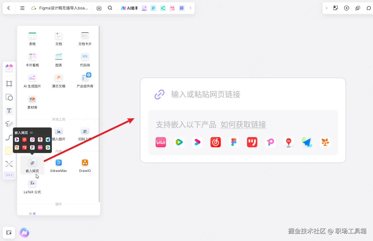在工作台上,点击“新建白板”按钮,创建一个新的boardmix白板文件。打开的画布上,点击左侧工具栏底部的“更多”选项,打开更多工具面板,选择其中的“嵌入网页”选项。接着,在boardmix画布上单击,添加一个卡片,并将刚才复制的Figma设计稿链接粘贴到卡片中。