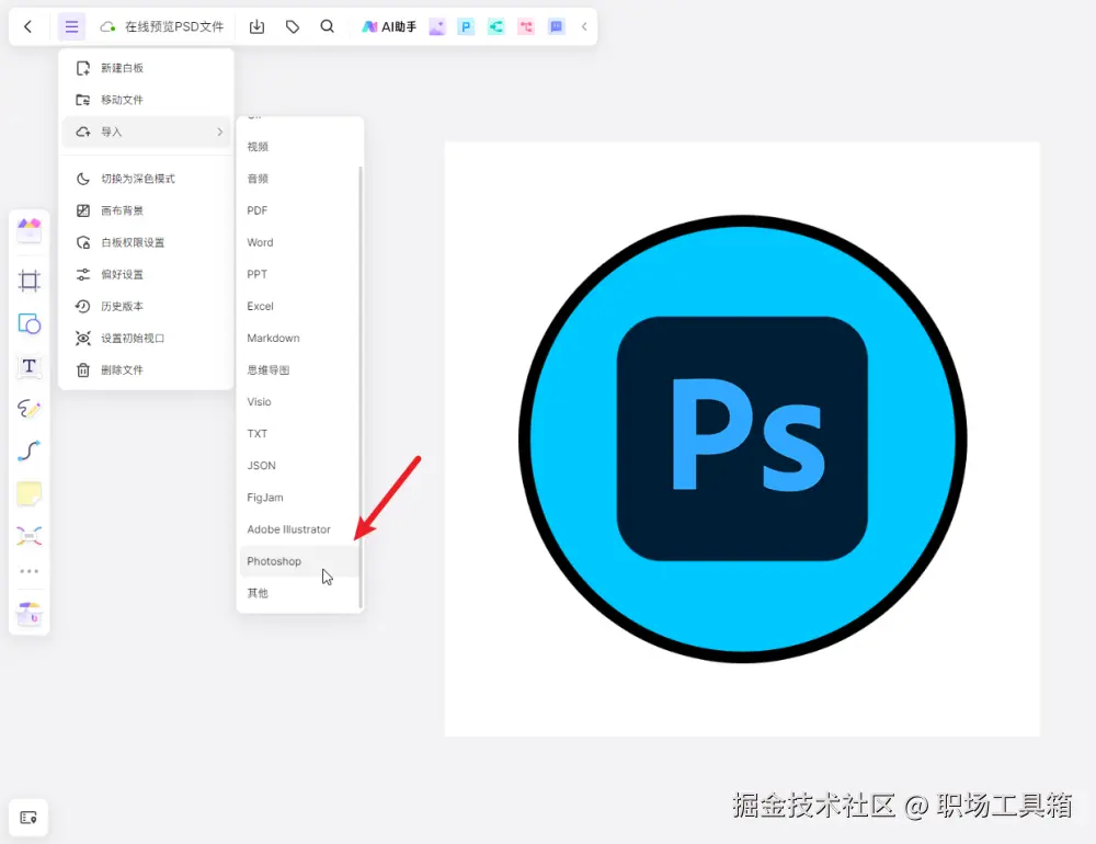 在任意一个boardmix白板文件中,点击左上角的设置,选择“导入 > Photoshop”,然后上传本地的PSD文件。