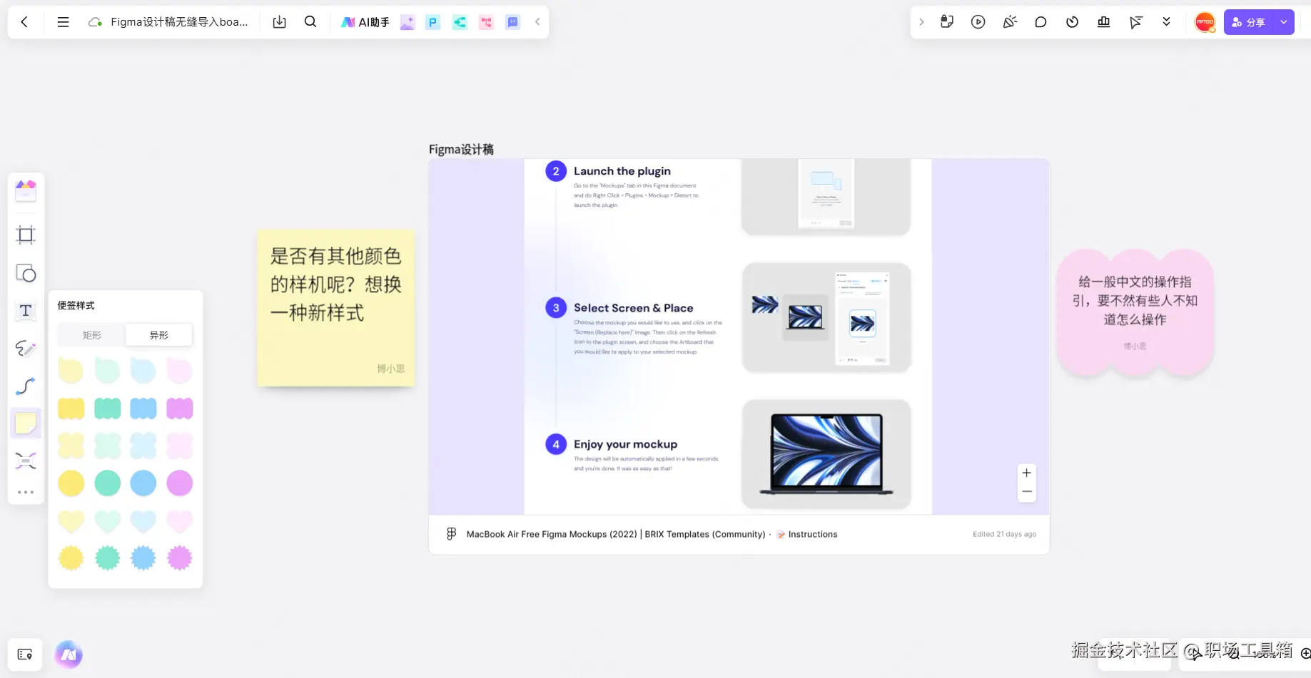 完成设计稿的导入后,你可以开始使用boardmix的各种标注工具进行设计评审。你可以使用便签、文本或文档等功能,在导入的Figma设计稿旁添加批注或修改意见。这使得团队成员可以清晰地表达自己的想法和建议,促进讨论。