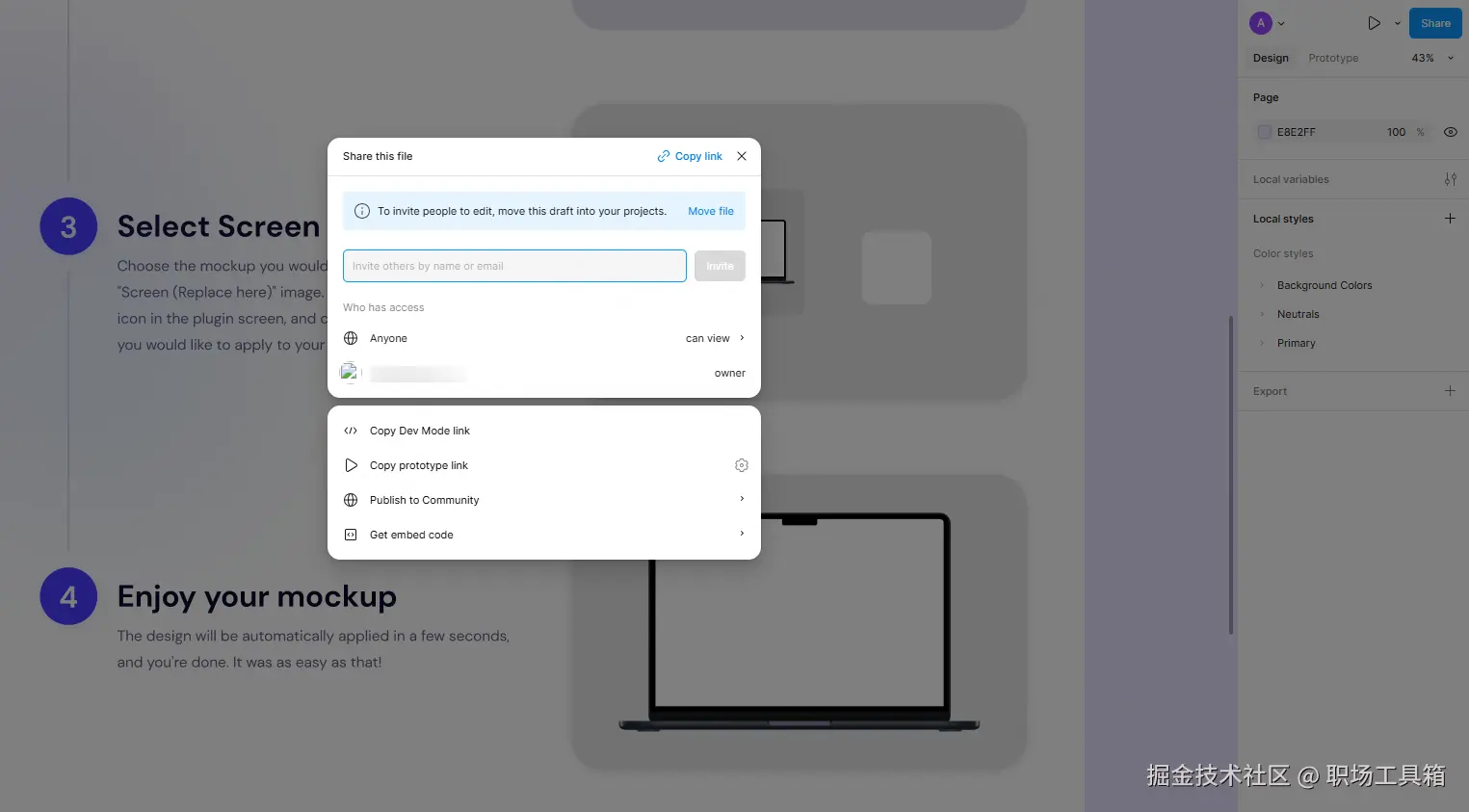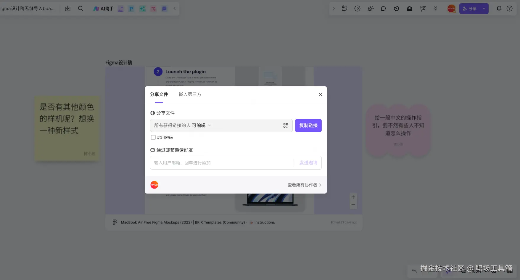首先,在Figma中打开你想要分享的设计稿,点击右上角的“Share”按钮。在弹出的窗口中,找到并点击“Copy link”按钮,复制该设计文件的链接。