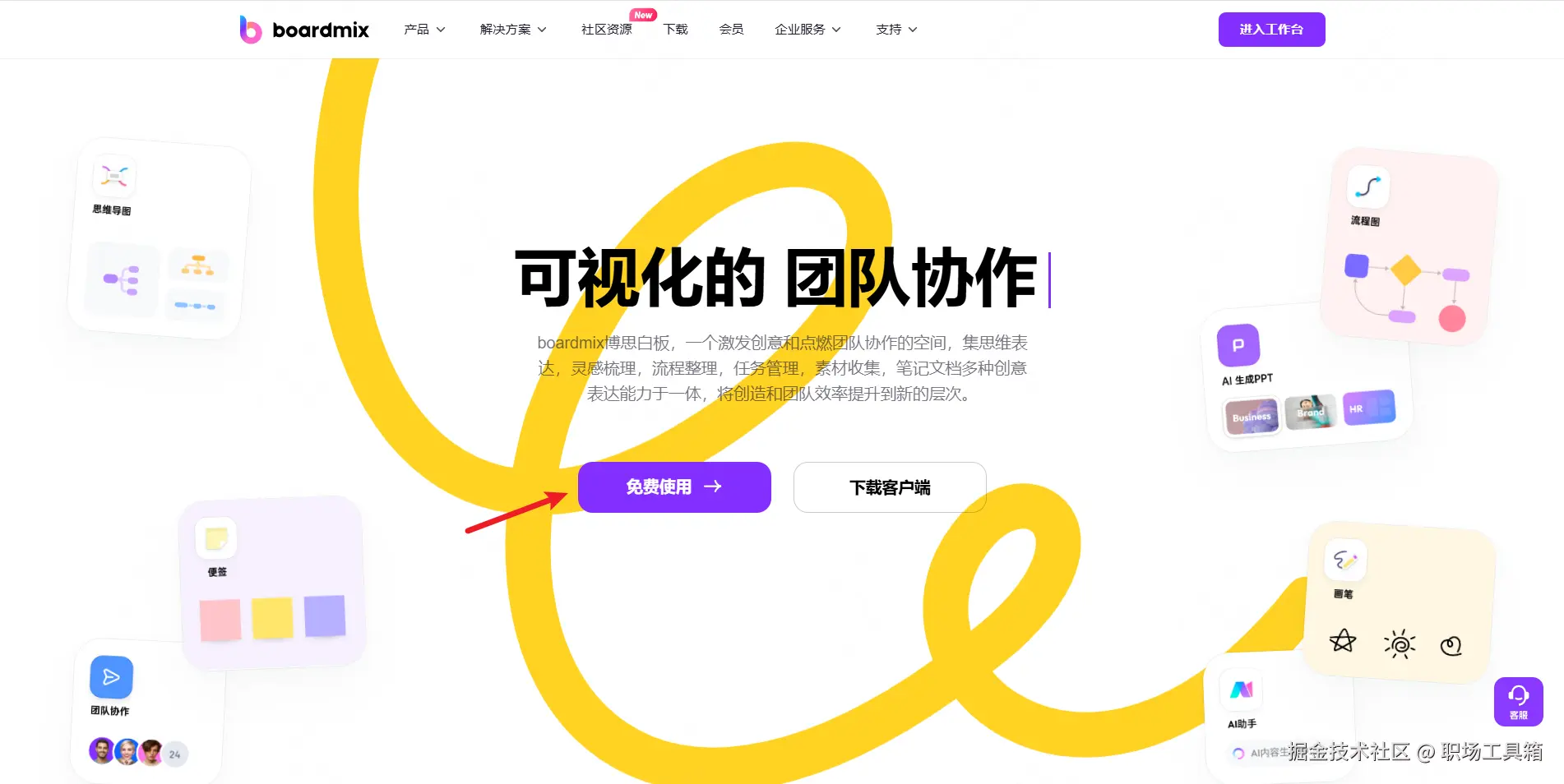 接下来,打开浏览器,访问boardmix首页,点击中间的“免费使用”按钮,进入boardmix工作台。