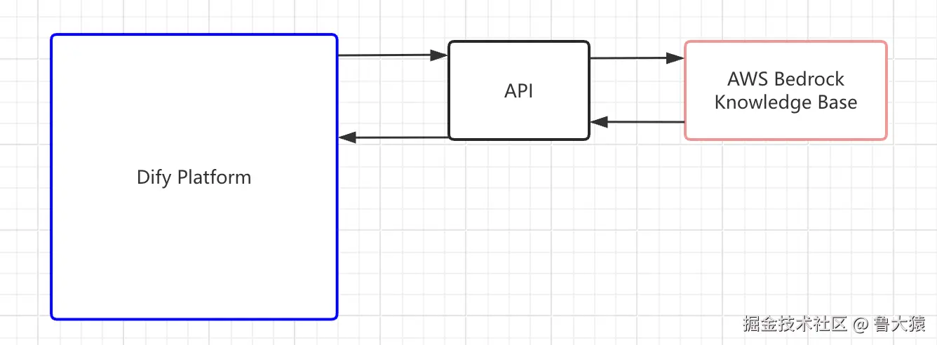 Dify 平台尚不能直接连接 AWS Bedrock Knowledge Base,需要开发团队参考 Dify 关于外部知识库连接的 API 定义,手动创建后端 API 服务,建立与 AWS Bedrock 的连接。具体架构示意图请参考: